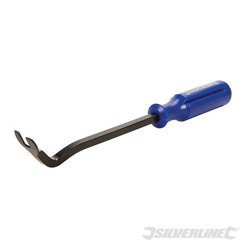 Herramienta para extraer tapicerías de vehículos. Extrae las grapas de los paneles sin dañar la superficie. Fabricado en acero forjado con mango de plástico.