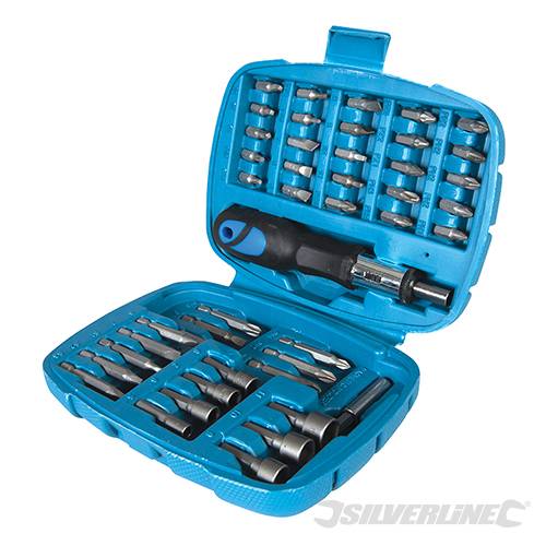 Mango de carraca engomado con funcionamiento en ambas direcciones y posición de bloqueo. Portapuntas magnético de 60 mm. Vástago hexagonal de 1/4" (6,35 mm). Incluye: puntas de 25 mm: Phillips 1 x PH1, 5 x PH2 y 1 x PH3. Pozidriv PZ1, 2 x PZ2 y PZ3. Planas: 1 x 5 mm, 3 x 6 mm y 1 x 7 mm. Trx 1 x T10, 2 x T15 y 1 x T20. Seguridad: 1 x 1, 2 x 3 y 1 x 3. Puntas 50 mm: Phillips 1 x PH1, 2 x PH2 y 1 x PH3. Planas 1 x 5 mm, 2 x 6 mm y 1 x 7 mm. Seguridad 1 x 1, 1 x 2 y 1 x 3. Vasos de 5 a 11 mm.