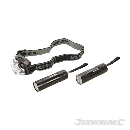 Juego de 2 linternas LED fabricadas en aluminio ligero y linterna frontal con cabezal giratorio de 3 LEDs y banda ajustable para mayor seguridad. Incluye botón de encendido/apagado de goma con diferentes funciones (2 LED color blanco, 1 LED color rojo y apagado). Incluye correa para muñeca para transportar fácilmente. Requiere 9 pilas AAA.