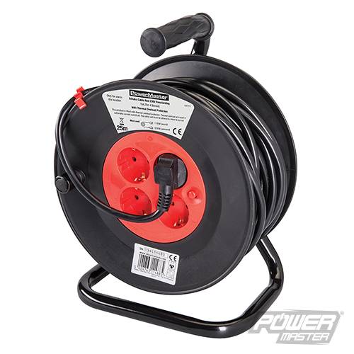 Protección termostática contra sobrecargas y botón reinicio. Manivela para recoger el cable fácilmente. Base robusta. 4 tomas de corriente europeas tipo F Schuko (CEE 7/4) 16 A. Carga máxima: 3000 W. (Desenrollar completamente al conectar aparatos de más de 1.100 W). Compatible con tomas de corriente tipo F (Bélgica, España, Alemanía, Holanda, Dinamarca, Portugal, Polonia, República checa, Eslovaquia, etc). Longitud del cable: 25 m.