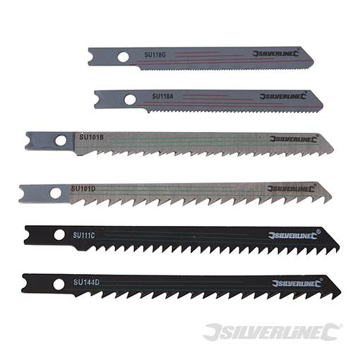 Juego de cuchillas para sierra de calar con vástago universal. 4 cuchillas para madera: SU101B corte limpio, SU101D corte limpio, SU111C corte rápido, SU144D corte rápido. 2 cuchillas para metal: SU118A corte limpio, SU118G corte limpio.