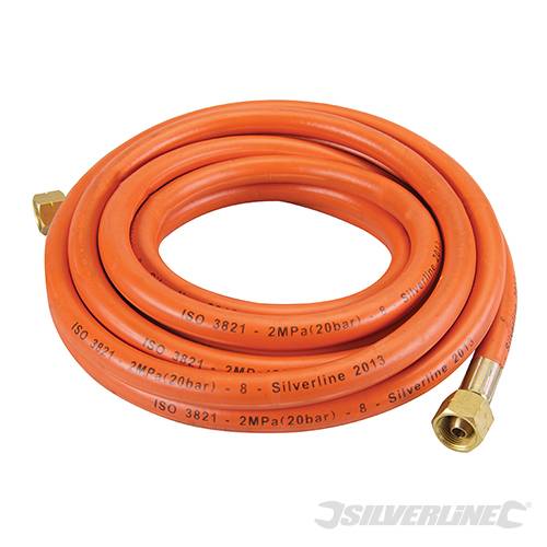 Manguera para gas propano y butano. Conectores de latón hembra de 3/8" (10 mm) con roscado hacia la izquierda. Presión máxima: 20 bar. Manguera conforme a BS EN ISO 3821:2010.