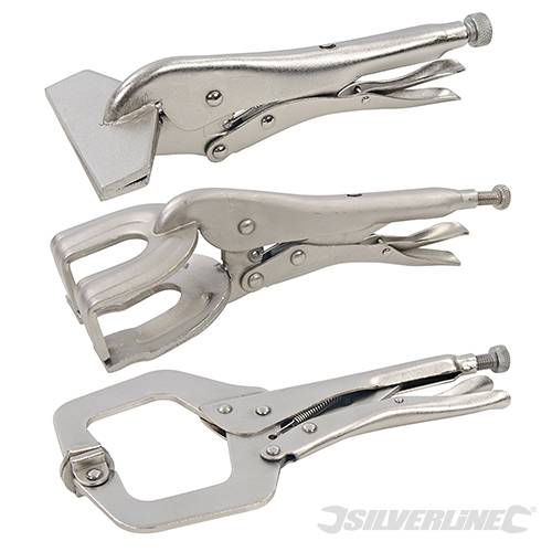 Juego de mordazas de acero niquelado resistente a la corrosión. Apertura ajustable y mecanismo de liberación rápida. Incluye: Mordaza de boca plana de 240 mm, mordaza para soldar de 280 mm y mordaza para soldar cuadrada de 275 mm.
