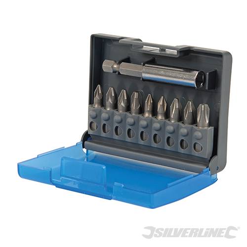 Juego de puntas para atornillador de acero cromo-vanadio 6150. Compatible con atornilladores y taladros inalámbricos. Portapuntas magnético. Vástago hexagonal de 6,35 mm. Incluye puntas Pozidriv: PZ1, 2 x PZ2, 1 x PZ3. Phillips: 2 x PH1, 2 x PH2, 1 x PH3 y portapuntas de cambio rápido.