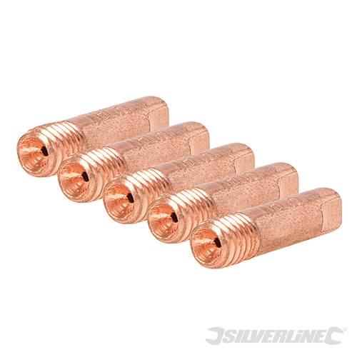 Puntas de cobre maquinadas con diseño cónico para facilitar el paso del alambre de soldadura. Compatible con la gama de soldadores MIG Silverline y otras marcas. Disponible en varios tamaños: ø0,6 mm, ø0,8 mm y ø1 mm. Dimensiones de la punta: Rosca M6 x 1 mm / Longitud: 25 mm.