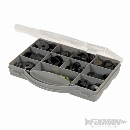 Juego de arandelas y diafragmas para ara reparar la mayoría de grifos. Incluye arandelas planas de 3/8", 1/2", 5/8" y 3/4, arandelas delta de 1/2 y 3/4". Arandelas Tantoflex de 1/2", arandelas cónicas con husillo de 1/2 y 3/4". Arandelas Supatap tipo A 1/2 y 3/4"; tipo D 1/2". Estuche de almacenaje con diferentes compartimentos. 146 piezas.