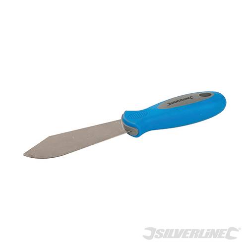 Hoja de acero elástico y templado resistente a la corrosión. Mango engomado en 2 colores con diseño ergonómico. Indicado para retirar masillas y adhesivos. Agujero para colgar.