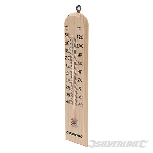 Termómetro de madera con visor de cristal sin mercurio. Funcionamiento con queroseno. Medidas en grados Celsius y Fahrenheit. Compatible para uso interior/exterior. Gancho para colgar. Dimensiones: 250 x 60 x 10 mm.